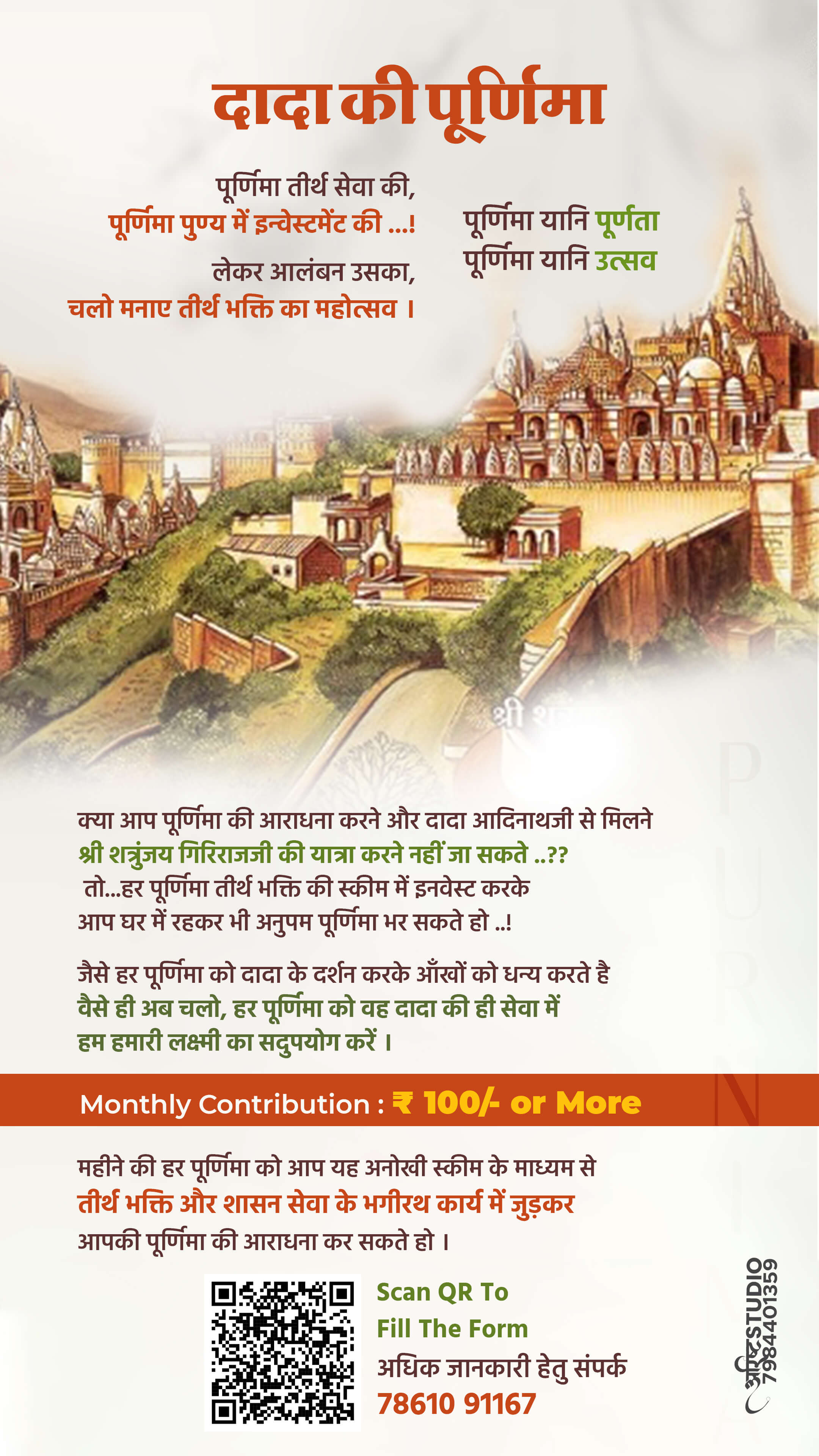 Just like doing darshan of Parmatma on every Poonam, you can now put your money to the best use in Seva of Parmatma on the same day of Poonam every month.